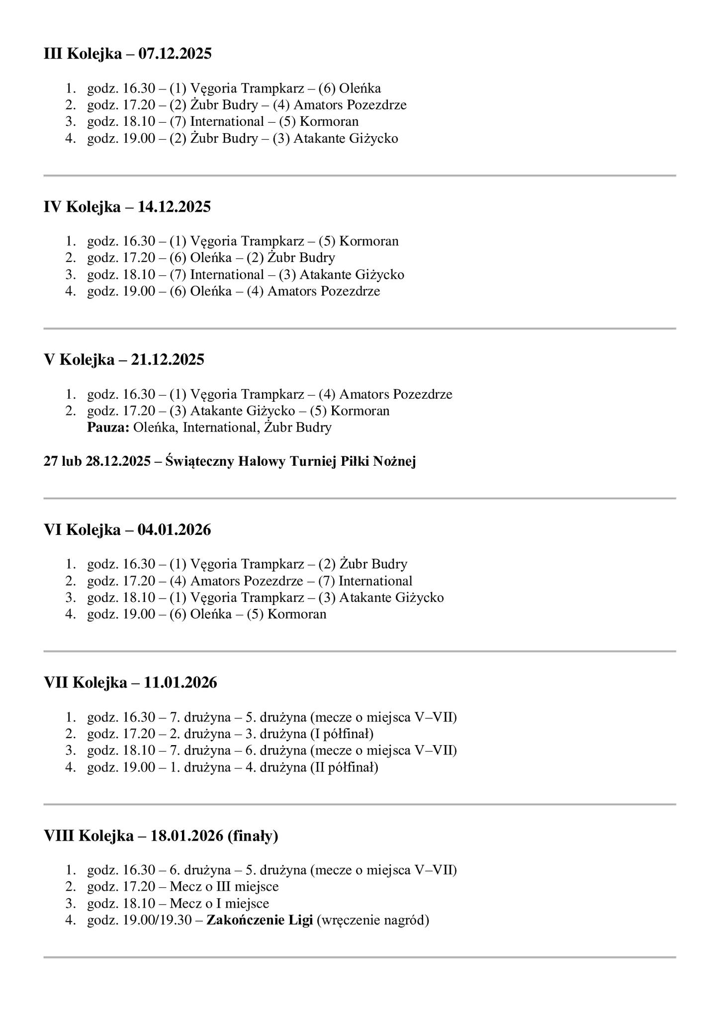d) IV mecz – 19.00 - W dniu 28 grudnia 2025 r. liga nie będzie rozgrywana (przerwa świąteczna).